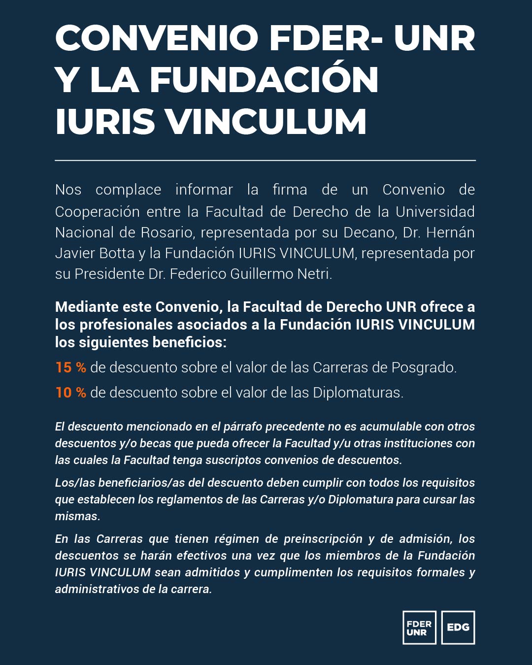 Mediante este Convenio, la Facultad de Derecho UNR ofrece a los profesionales asociados a la Fundación IURIS VINCULUM los siguientes beneficios: