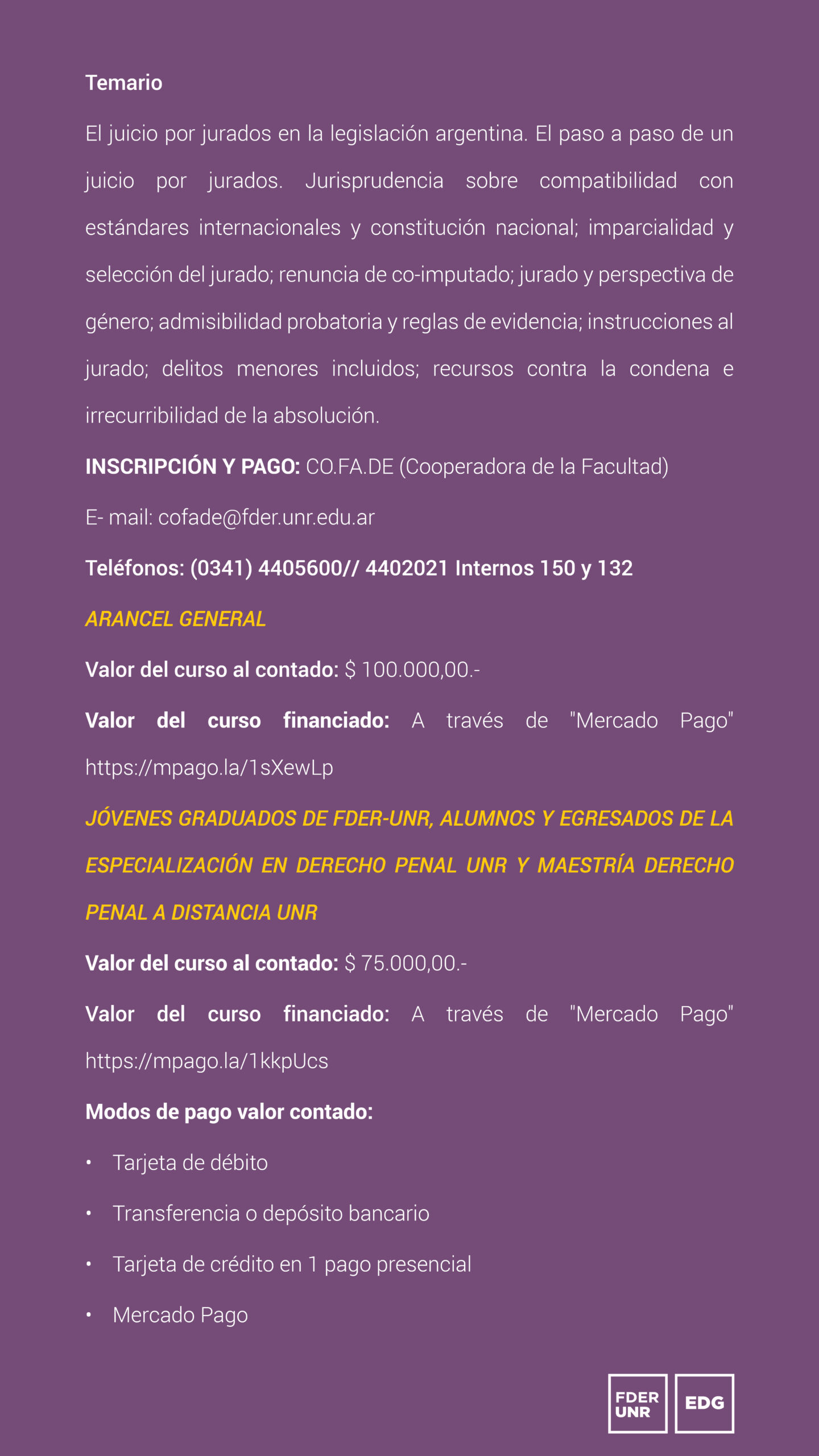 - Arancel para Jóvenes Graduados FDER-UNR; Alumnos y Egresados de las Carreras de Especialización en Derecho Penal UNR y Maestría en Derecho Penal a distancia UNR: https://mpago.la/1kkpUcs