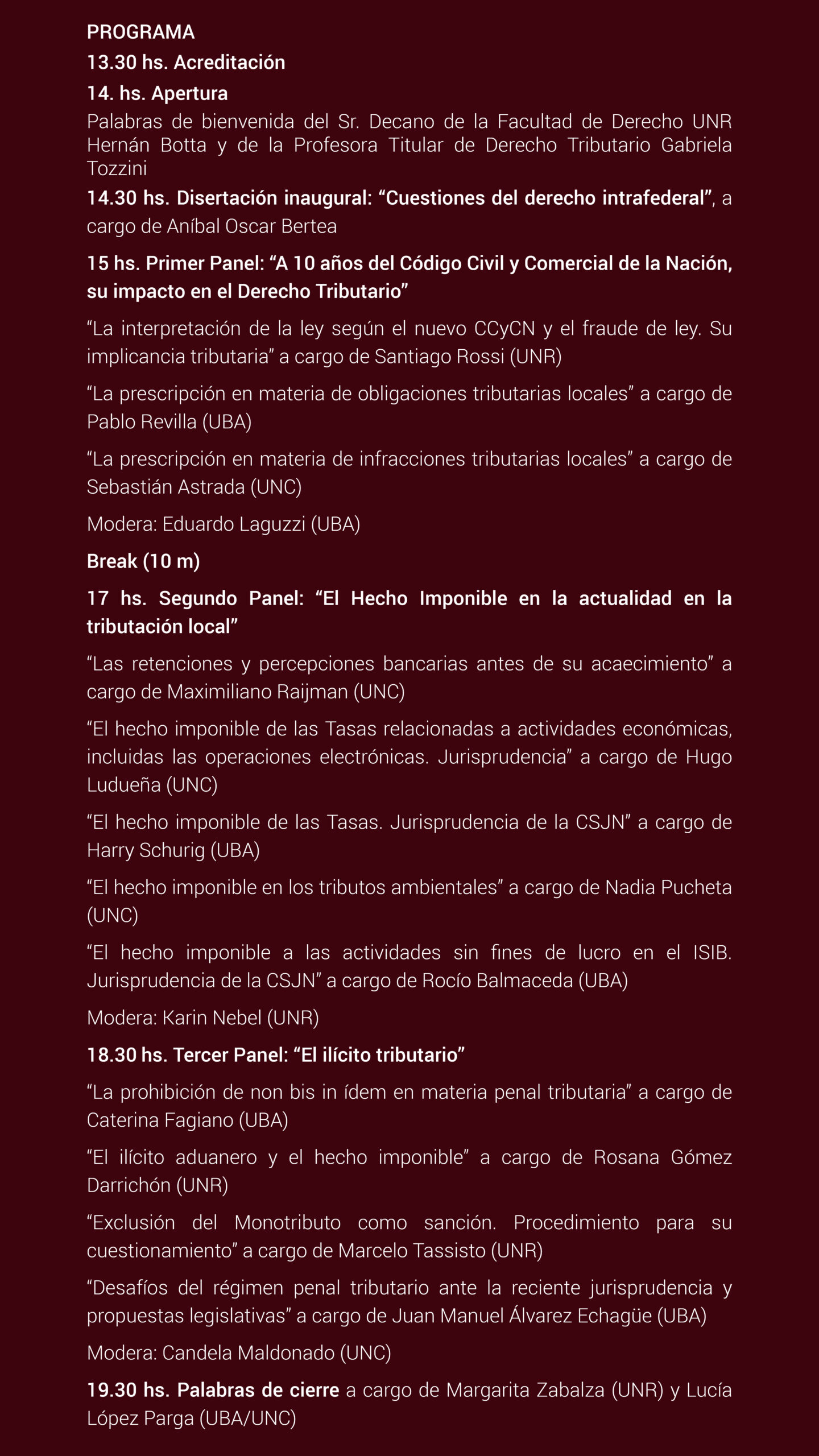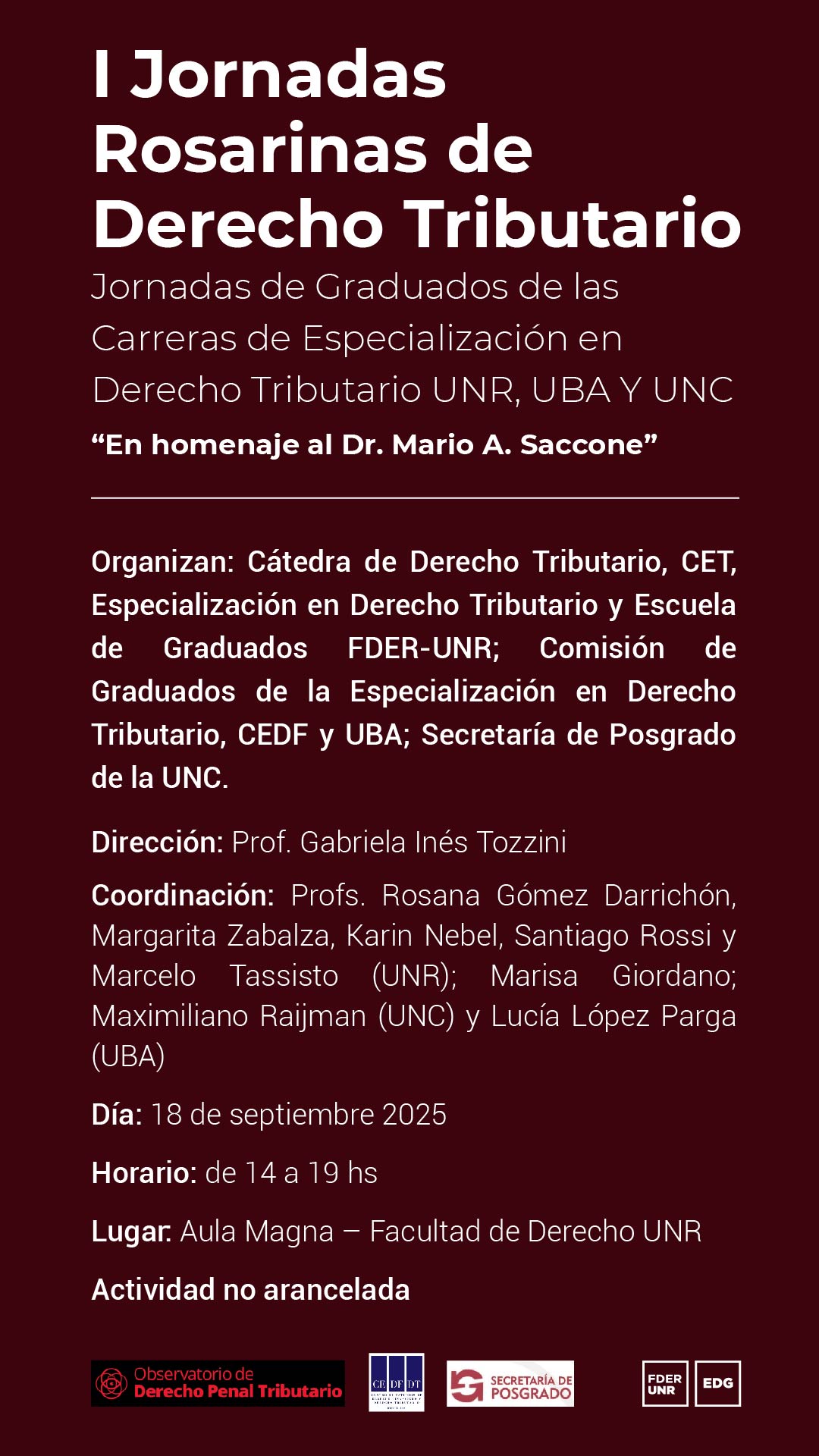 Organizan: Cátedra de Derecho Tributario, CET, Especialización en Derecho Tributario y Escuela de Graduados FDER-UNR; Comisión de Graduados de la Especialización en Derecho Tributario, CEDF y UBA; Secretaría de Posgrado de la UNC.