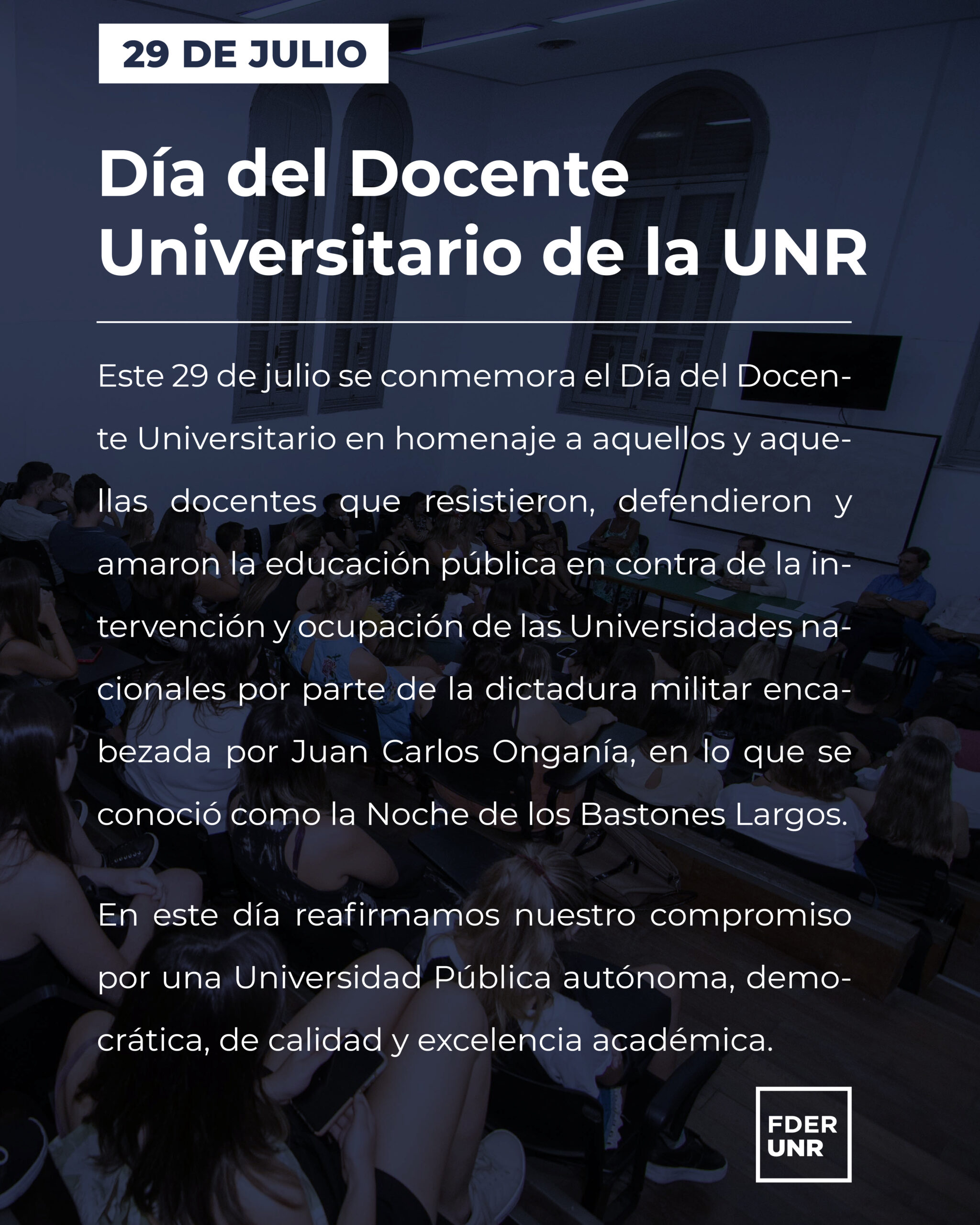 Este 29 de julio se conmemora el Día del Docente Universitario en homenaje a aquellos y aquellas docentes que resistieron, defendieron y amaron la educación pública en contra de la intervención y ocupación de las Universidades nacionales por parte de la dictadura militar encabezada por Juan Carlos Onganía, en lo que se conoció como la Noche de los Bastones Largos.
